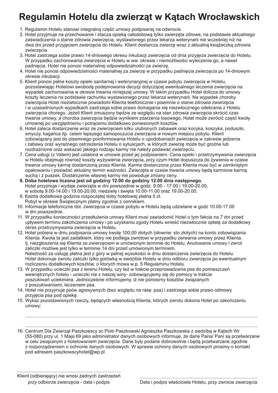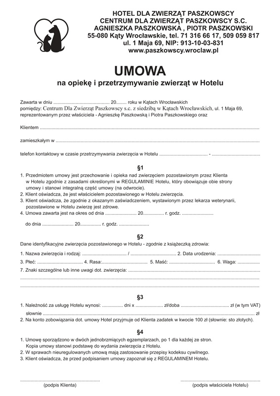 Należność za usługę płatna jest z góry w pełnej wysokości w dniu dostarczenia zwierzęcia do hotelu.
